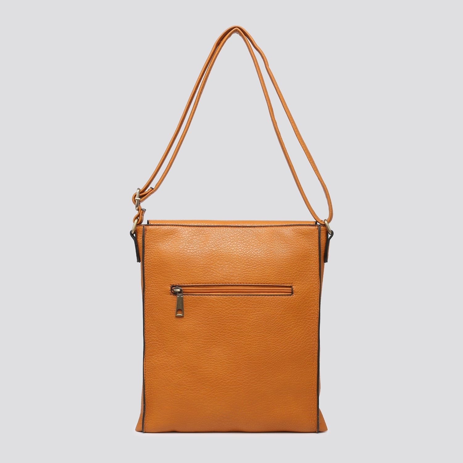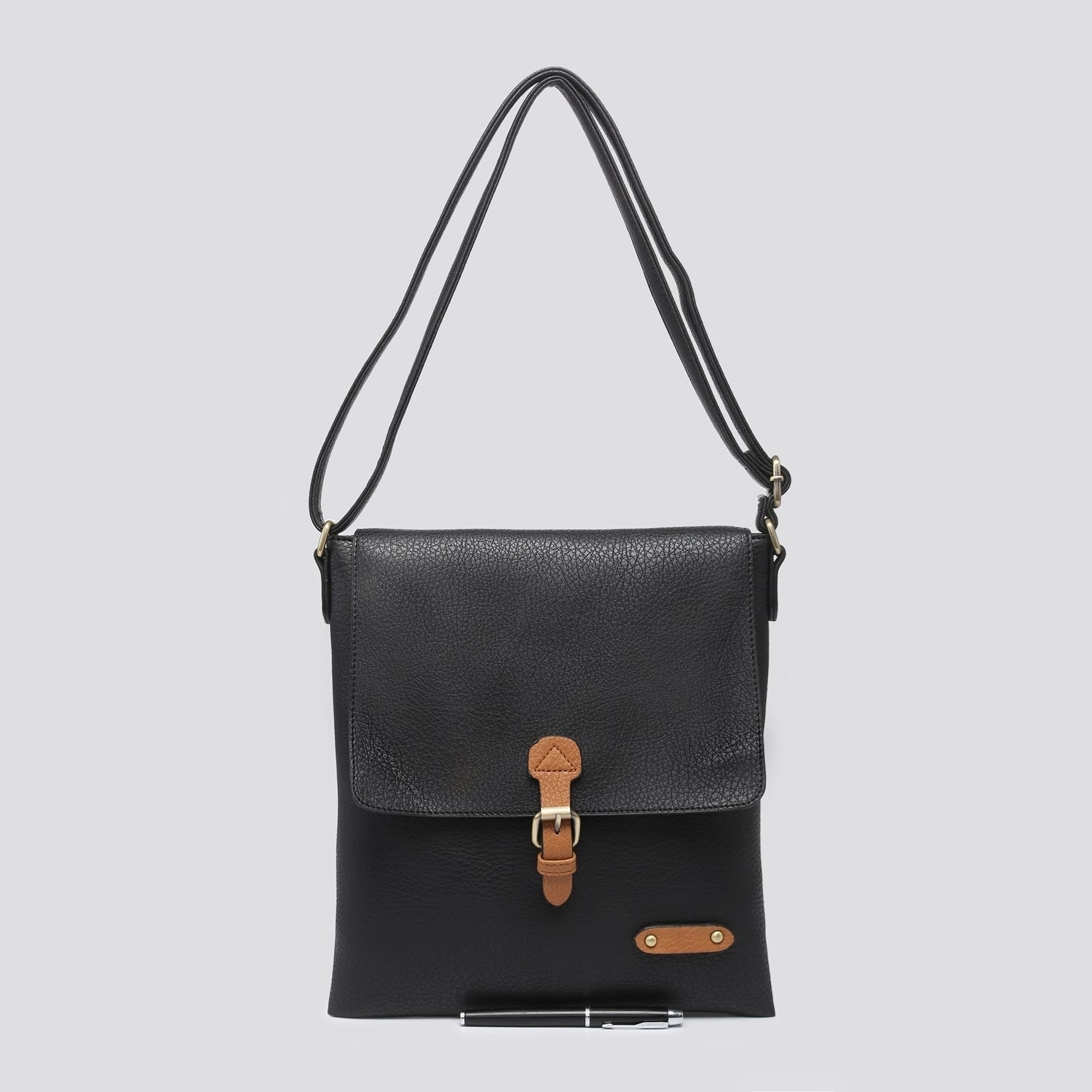 This black faux leather crossbody style handbag has a designer look. It's a perfect size, lightweight & great for days out or holidays. With a flap over style opening with tan satchel style buckle, zip top, internal zip pocket & phone pockets. Adjustable strap. Available in other colours.