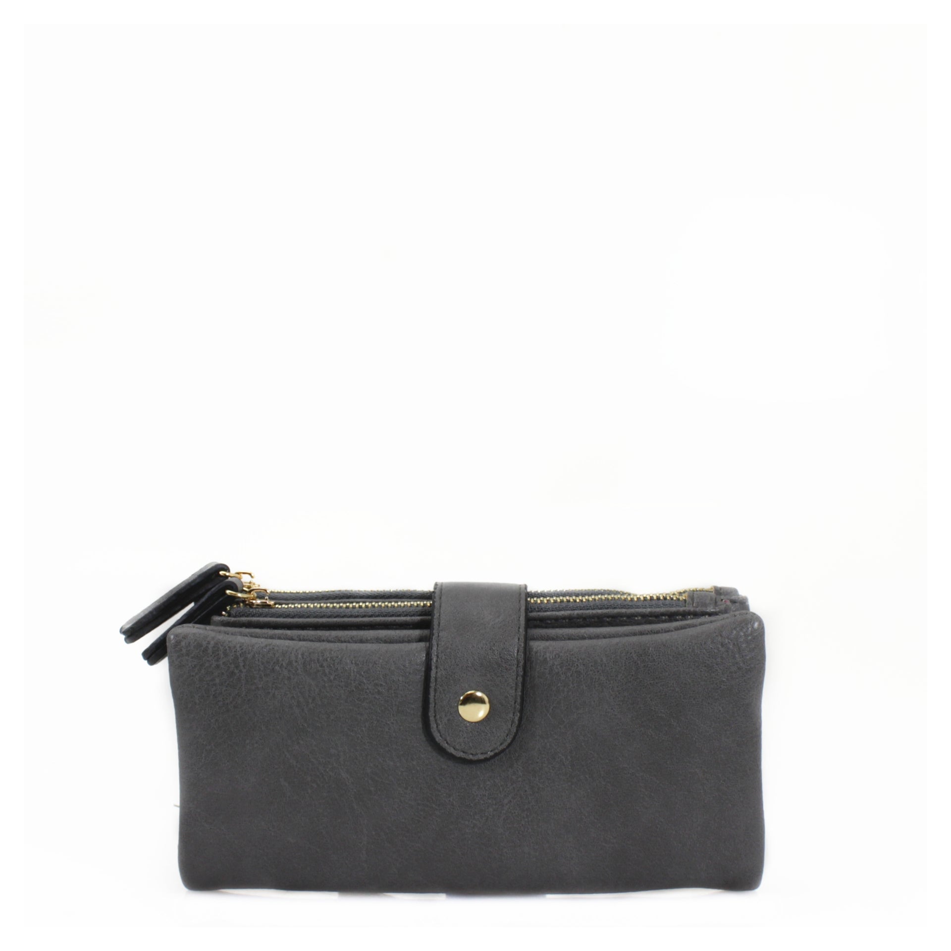 Soft faux leather dark grey purse with internal zipped coin purse & 12 credit card spaces. Stylish fastener with gold stud button.