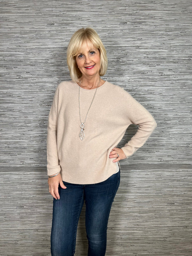 Fine knit round neck oatmeal sweater with back panel detail perfect for everyday wear and layering.