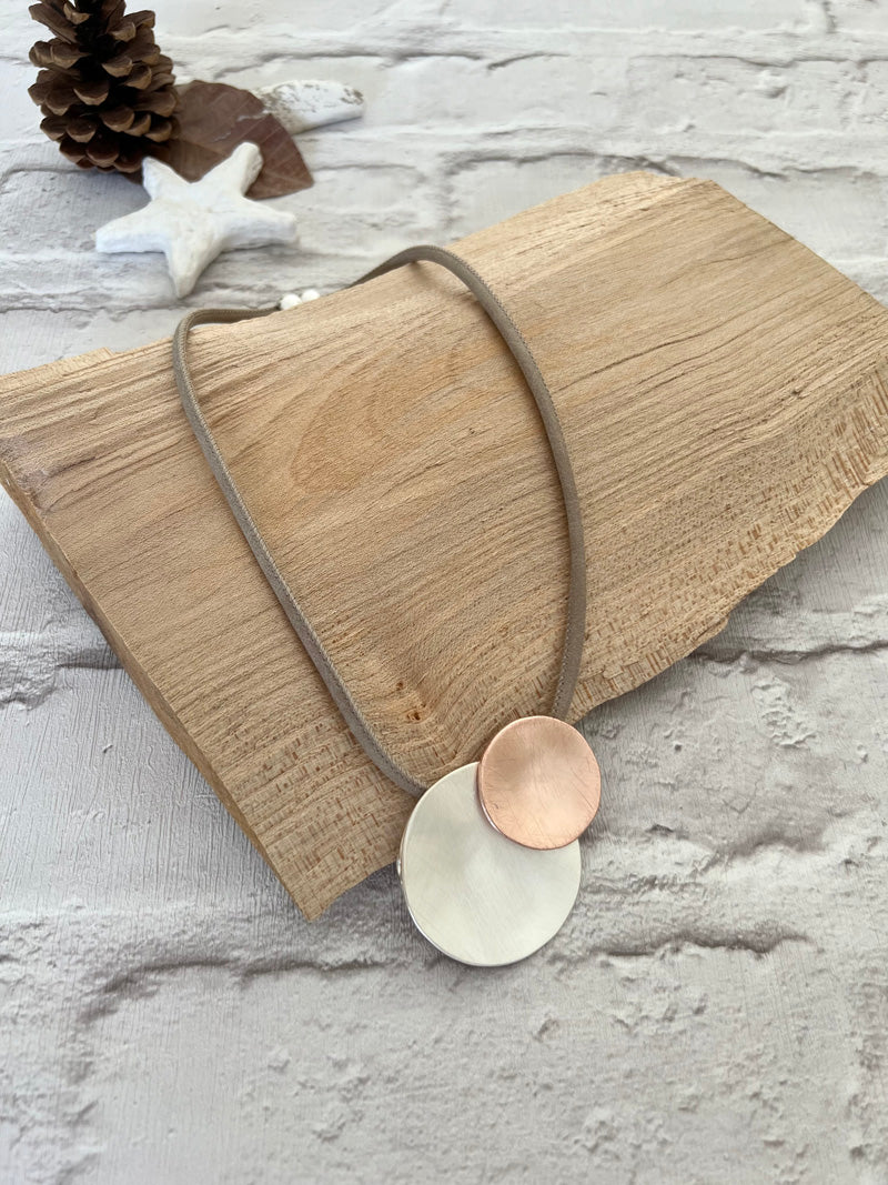 Satin silver & rose gold effect circles on a taupe leather effect short necklace.